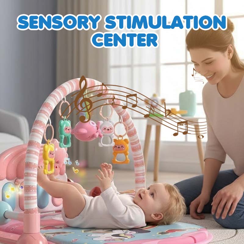 Килимът включва висящи играчки, светлини и звуци, които стимулират зрението, слуха и допира. Ускорява развитието на когнитивните и моторни умения в ранна възраст.
