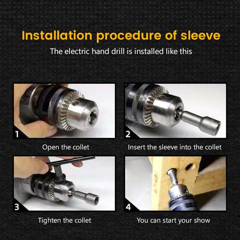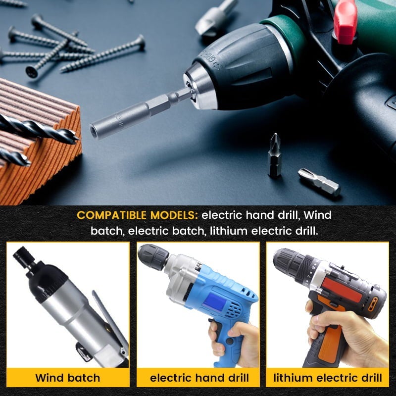 Съвместими модели: Задълбочете втулката, по-добре е да извадите по-дългите винтове и болтове, могат да се използват и ежедневни къси болтове. Подходящ е за повечето ръчни електрически бормашини, вятърни, електрически и литиеви електрически бормашини. -