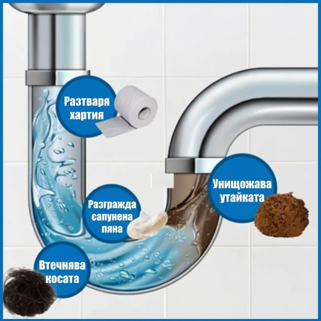 Няма да увреди канализацията, тръбите или септичната система, тъй като е произведен само от некорозивни и некаустични материали.