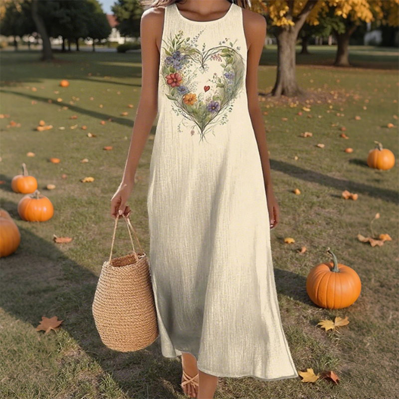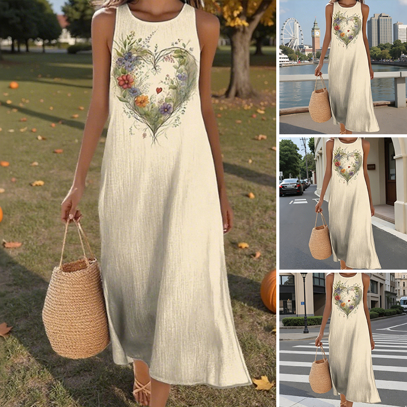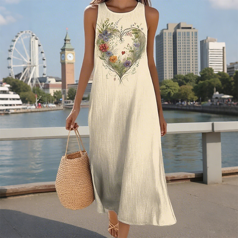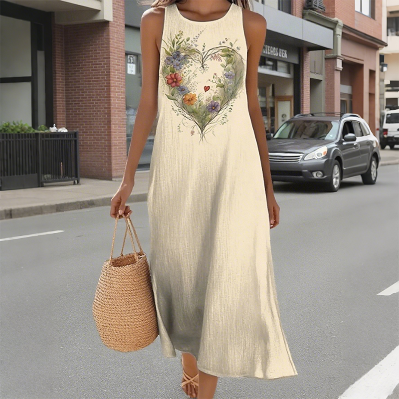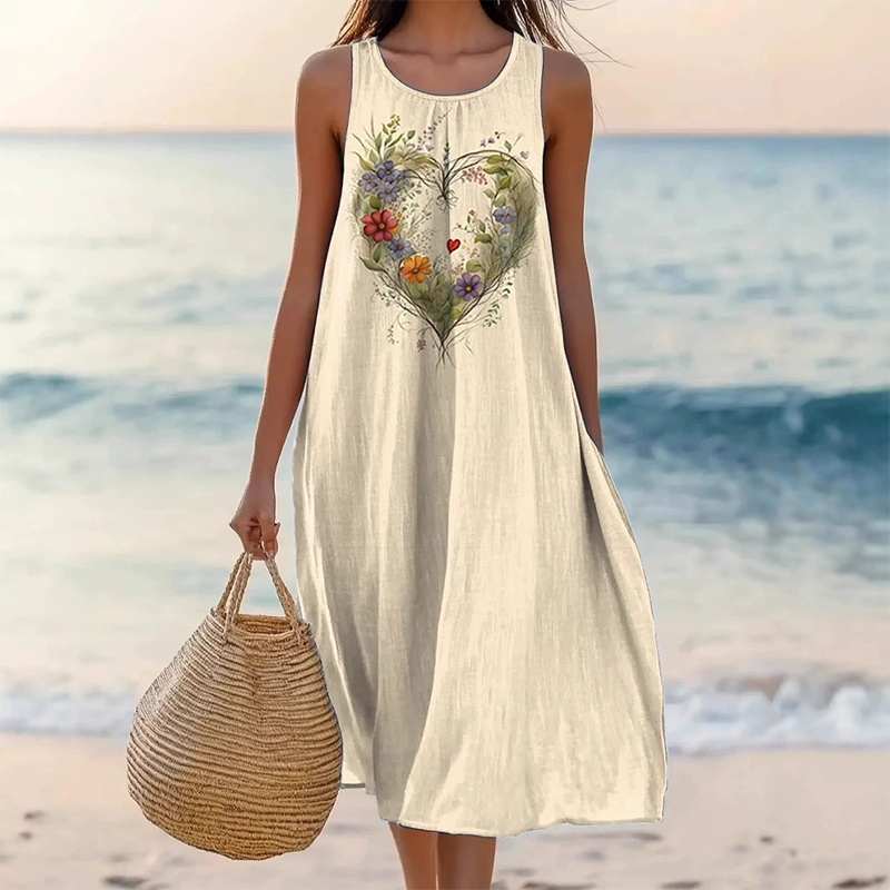 👗 ЛЕК И ЕЛЕГАНТЕН СТИЛ – Привлечи погледите с лекота. Направи изящно впечатление навсякъде с тази рокля с щампа на сърце и цветя. Смелият мотив на сърцето, комбиниран с ярки флорални елементи, излъчва игрива елегантност. Свободната и ефирна кройка придава непринудена увереност – идеална за бранч, уикенд разходки или плаж.