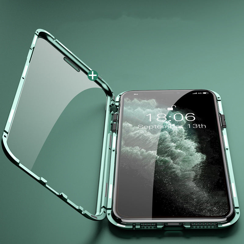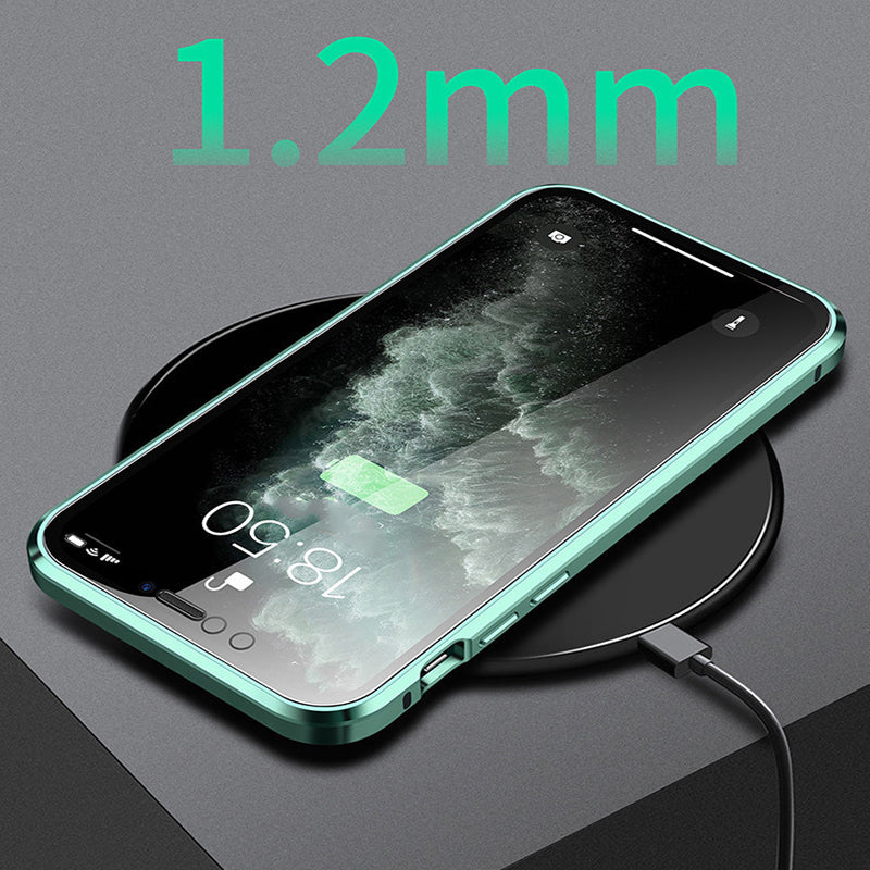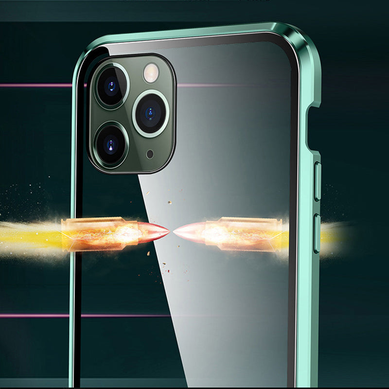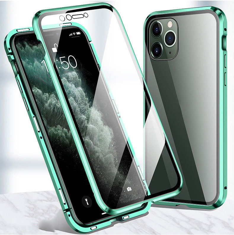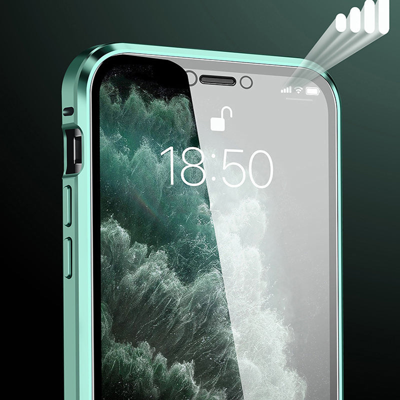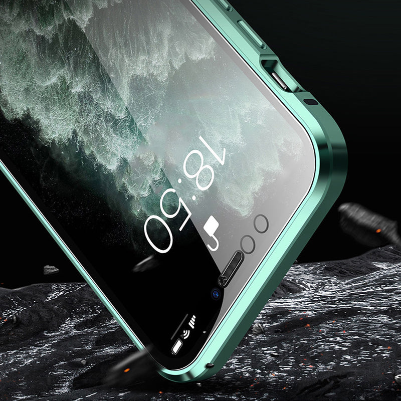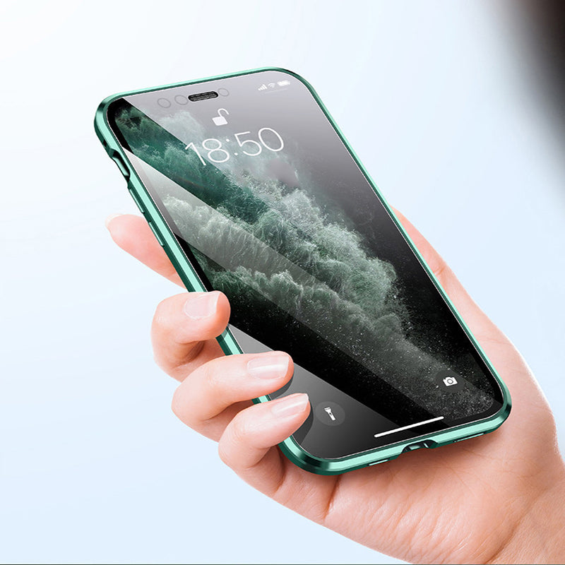 Този премиум кейс има тънък дизайн с метална рамка и двустранно закалено стъкло, предоставяйки пълна защита за вашия телефон. Оборудван е с магнитен монтаж за лесно и сигурно закрепване.