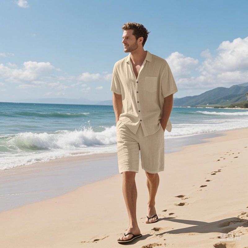 ДИШАЩА СМЕС ОТ ПАМУК И ЛЕН - ОСТАНЕТЕ ХЛАДНИ, СУХИ И КОМФОРТНИ: Изработена от висококачествена смес от памук и лен, тази екипировка осигурява въздушен поток и управление на влагата при горещ климат. Материята се усеща лека върху кожата и изсъхва бързо - идеална за влажни дни или за почивка след плаж. Това е дишащо решение, което повишава комфорта, без да жертва стила.