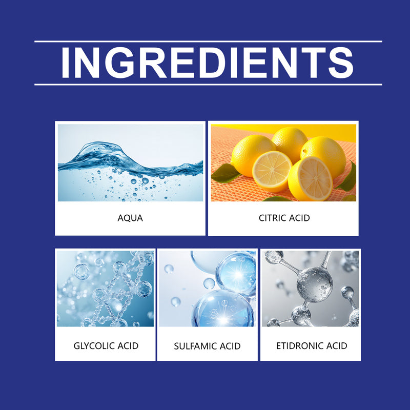 Основни съставки: Вода, лимонена киселина, амидосулфонова киселина, гликолова киселина, хидроксиетилидендифосфонова киселина