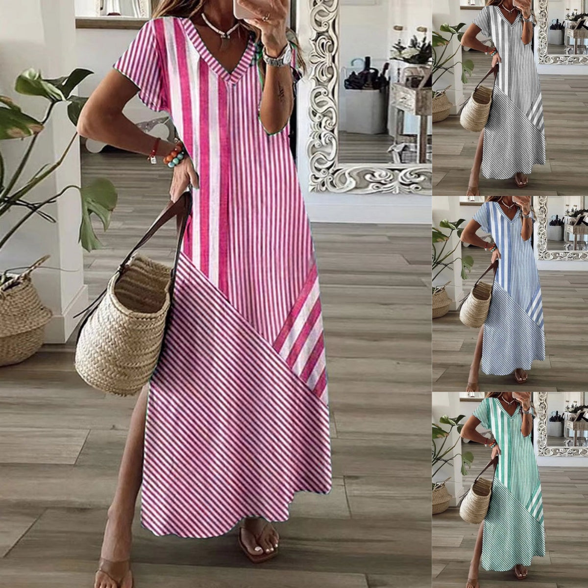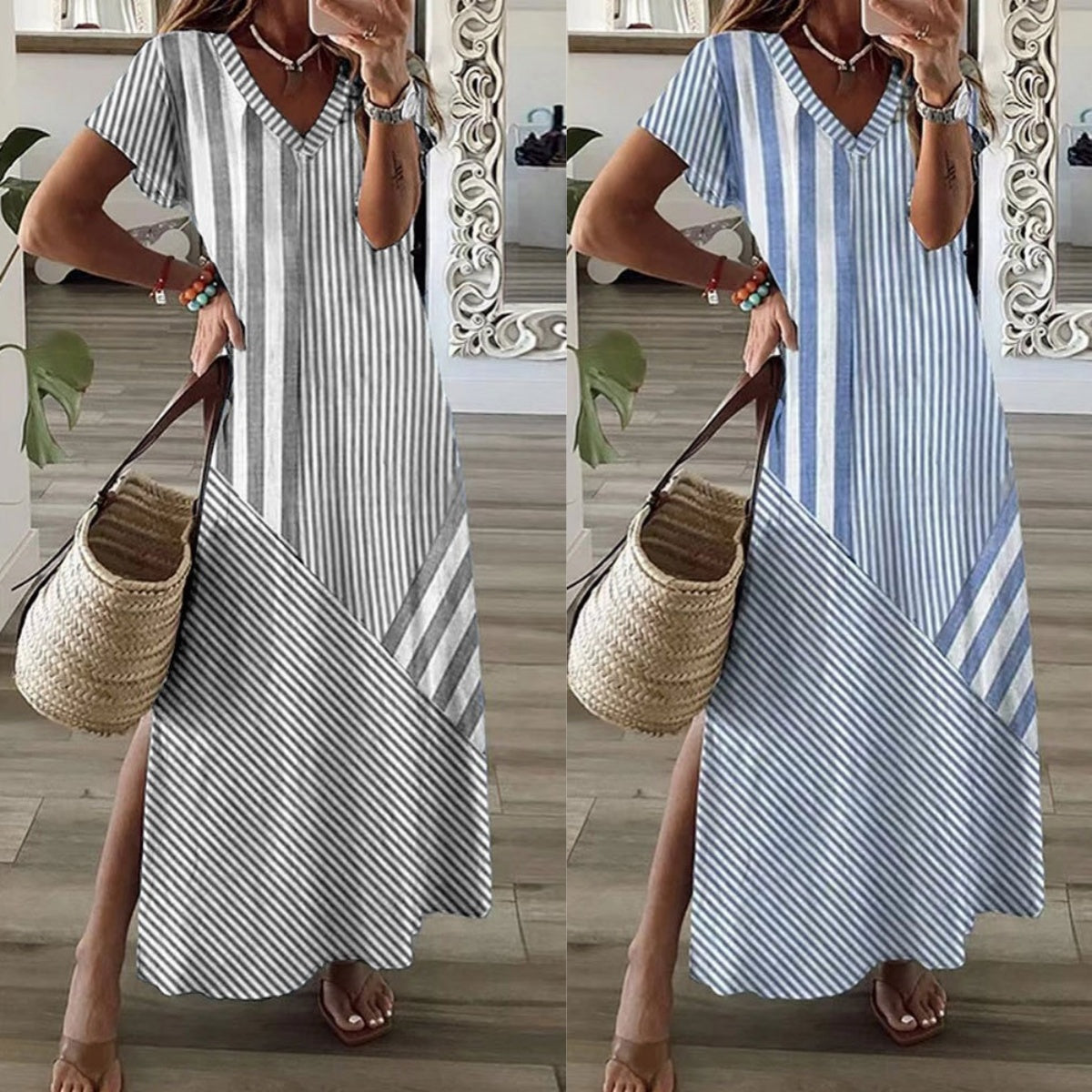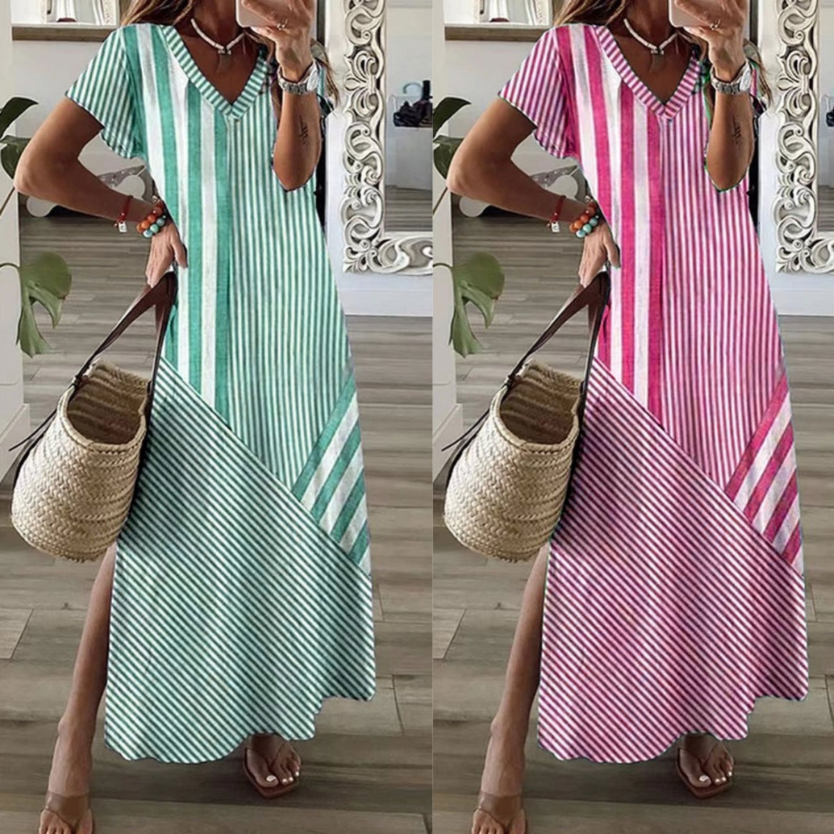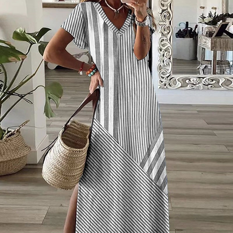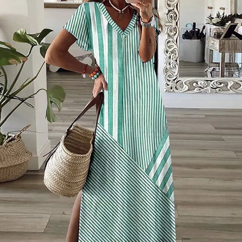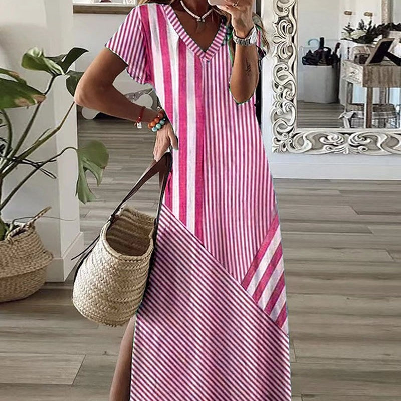 1* Дамска рокля на райета с V-образно деколте и разрез