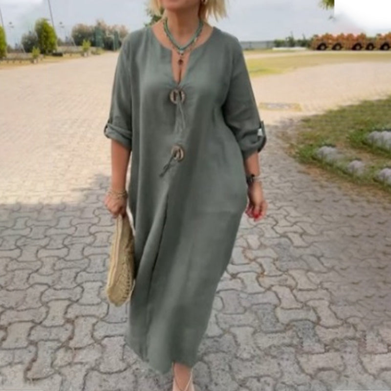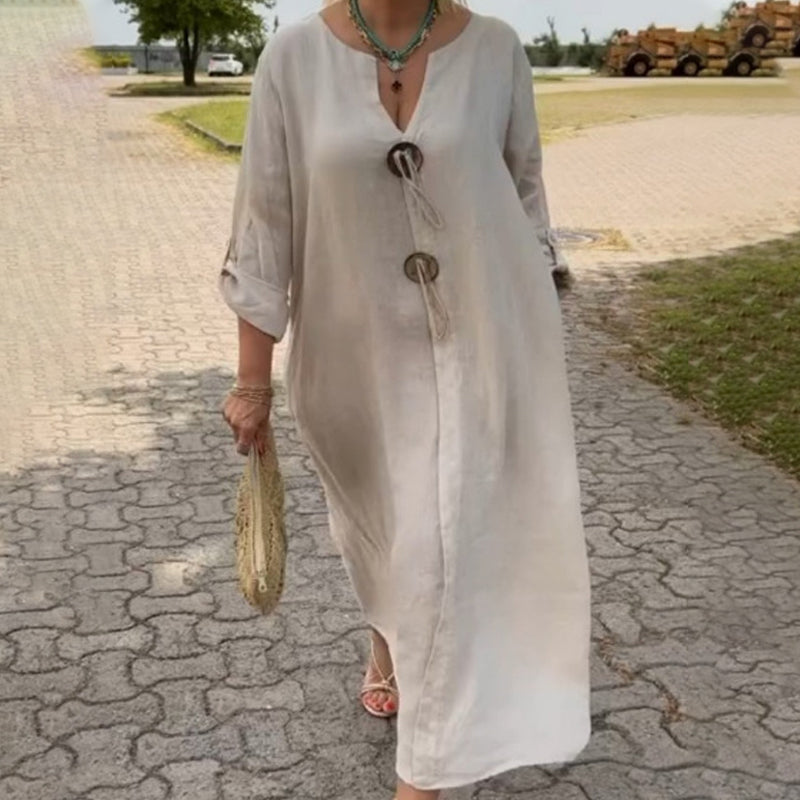 Смелият декор подчертава изчистената красота. Огромните кръгли копчета придават на тази минималистична рокля незабавен визуален ефект. Те са подредени така, че да привличат погледа и да добавят елемент на игривост и елегантност, което прави роклята подходяща както за неформален брънч, така и за полуофициални поводи.